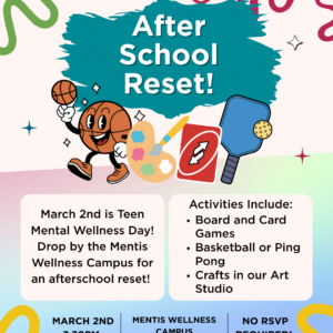 🥳March 2nd is World Teen Mental Wellness Day!🥳 Celebrate with us by stopping by the Mentis Wellness Campus for some afterschool wellness hours! Be sure to stop by, grab a snack, play a game, and celebrate wellness🧘♀️ Ages 13-18 welcome!
