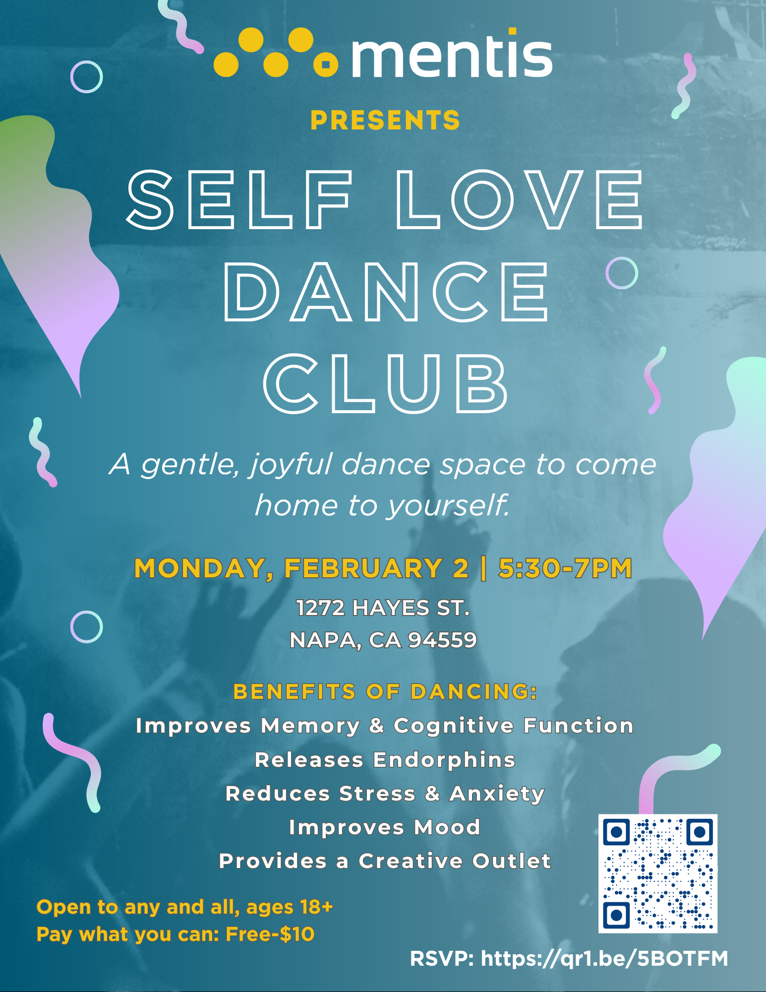 Join us for an evening of movement, music, and connection designed to support mental health, release stress, and boost feel-good endorphins.